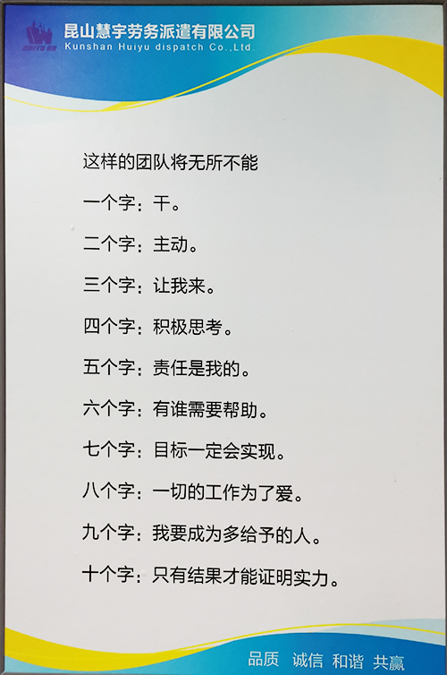 昆山慧宇勞務(wù)派遣有限公司成立于2010年,經(jīng)昆山市市場(chǎng)監(jiān)督管理局登記,集國(guó)內(nèi)勞務(wù)派遣,物業(yè)管理,企業(yè)管理服務(wù)、非行政許可商務(wù)信息咨詢;職業(yè)中介、人才中介等為一體的大型合法勞務(wù)機(jī)構(gòu)。公司秉承“品質(zhì)、誠(chéng)信、和諧、共贏”的宗旨,保持嚴(yán)謹(jǐn)自律的工作作風(fēng);遵紀(jì)守法,嚴(yán)格按照勞動(dòng)相關(guān)法律作業(yè);經(jīng)昆山人力資源和社會(huì)保障局核發(fā)【勞務(wù)派遣經(jīng)營(yíng)許可證】及【人力資源服務(wù)許可證】資質(zhì)的專業(yè)勞務(wù)服務(wù)公司。